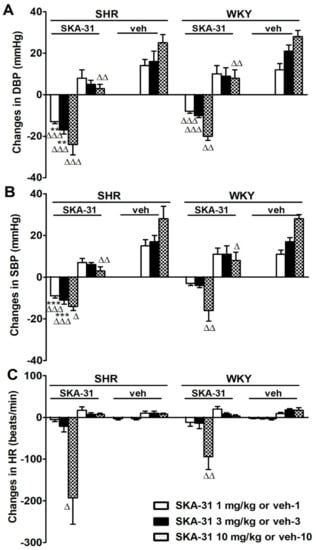 Influence of SKA-31 (1, 3, 10 mg/kg; i.v.) or vehicle on (A) diastolic blood pressure (DBP), (B) systolic blood pressure (SBP) and (C) heart rate (HR) of urethane-anaesthetized spontaneously hypertensive rats (SHR) and Wistar Kyoto rats (WKY). Mean ± SEM, n = 16, ** p < 0.01, *** p < 0.001 compared to respective WKY group; Δ p < 0.05, ΔΔ p < 0.01, ΔΔΔ p < 0.001 compared to respective group receiving vehicle for SKA-31.