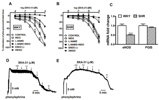 Influence of indomethacin (INDO, inhibitor of cyclooxygenase, COX, 10 μM) and Nω-nitro-L-arginine methyl ester (l-NAME, inhibitor of nitric oxide synthase, NOS, 100 μM) given alone or together, or endothelium physical disruption on the vasorelaxant effects of SKA-31 in the small mesenteric arteries (sMAs) from WKY (A) and spontaneously hypertensive (SHR) rats (B). RT-qPCR analysis of eNOS and PGIS in vessels isolated from SHR and WKY rats. Results shown as relative fold change in mRNA expression in SHR in comparison to WKY controls, where expression level was set as 1.0 (C). The representative original traces of the SKA-31 induced relaxation of sMAs derived from WKY (D) and SHR (E). Arrows show the moment of application of the particular concentrations of SKA-31. Broken arrows represent the following concentrations (from the left): 0.03, 0.3, 3 µM, respectively. Results are expressed as a percentage of relaxation of the isometric contraction induced by phenylephrine (Phe). Mean ± SEM of n = 5–14 animals for each curve or mRNA levels. In a few cases, the SEM is smaller than or equal to the size of symbols. *** p < 0.001 compared to WKY. See Table 2 for statistical analyses.