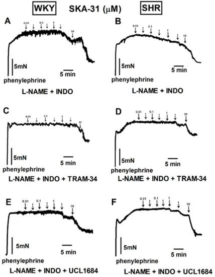 Traces from representative experiments showing the influence of indomethacin (INDO, 10 μM) and NAME -l-arginine methyl ester (l-NAME, 100 μM) given together (A,B), TRAM-34 (10 μM; C,D) or UCL1684 (0.1 μM; E,F) given in the presence of l-NAME and INDO (100 μM and 10 μM, respectively) on the vasorelaxant effect of SKA-31 in the small mesenteric arteries from normotensive WKY (A,C,E) and spontaneously hypertensive (SHR) rats (B,D,F). Arrows show the moment of application of the particular concentrations of SKA-31. Broken arrows represent the following concentrations (from the left): 0.03, 0.3, 3 µM, respectively.