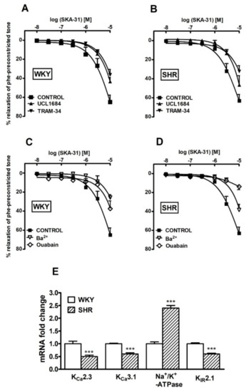 Influence of UCL1684 (0.1 μM), TRAM-34 (10 μM), Ba2+ (30 μM) and ouabain (100 μM) on the vasorelaxant effect of SKA-31 in the presence of l-NAME and indomethacin (INDO) (100 μM and 10 μM, respectively; CONTROL) in small mesenteric arteries from normotensive Wistar Kyoto (WKY) (A,C) and spontaneously hypertensive (SHR) rats (B,D). RT-qPCR analysis of KCa2.3, KCa3.1, Na+/K+-ATP-ase, and Kir2.1 in vessels isolated from SHR and WKY rats. Results shown as relative fold change in mRNA expression in SHR in comparison to WKY controls, where expression level was set as 1.0 (E). Results are expressed as a percentage of relaxation of the isometric contraction induced by phenylephrine (Phe). Mean ± SEM of n = 5–14 animals for each curve. In a few cases, the SEM is smaller than or equal to the size of symbols. *** p < 0.001 compared to WKY. See Table 2 for statistical analyses.