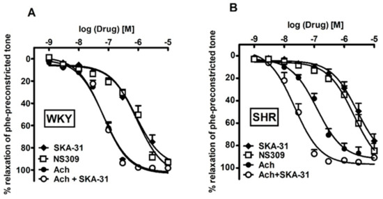 SKA-31 (0.01–10 µM), NS309 (0.001–10 µM) and Ach (0.001–10 µM) produced a concentration-dependent, nearly complete relaxation in sMAs preconstricted with phenylephrine in WKY (92.8 ± 2.3, 92.9 ± 2.9, 97.2 ± 1.0, respectively) and in SHR (75.8 ± 6.1, 84.7 ± 6.7, 90.5 ± 3.9, respectively) (Figure 7A,B). The rank order of potencies (pEC50) of ligands in the relaxation experiments in WKY versus SHR was: Ach (7.2 ± 0.08, n = 11 vs. 6.9 ± 0.05, n = 11; p < 0.01) > SKA-31 (6.0 ± 0.1, n = 12 vs. 5.5 ± 0.10, n = 13; p < 0.01) ≥ NS309 (6.0 ± 0.1, n = 5 vs. 5.6 ± 0.07, n = 7; p < 0.05). Incubation with SKA-31 (0.1 µM) enhanced the potency of Ach-mediated relaxation only in the SHR group and did not affect the maximum relaxation response (Figure 7A,B, pEC50 for Ach 6.9 ± 0.05, n = 11; SKA-31 + Ach 7.6 ± 0.10, n = 10; p < 0.01).