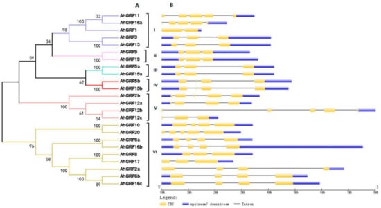 Exon–intron structures of AhGRF genes according to their phylogenetic relationships. (A) An unrooted phylogenetic tree was constructed based on the amino acid sequences. (B) Exon–intron structure analysis of AhGRF genes performed using the online tool GSDS. The lengths of exons and introns of each AhGRF gene are drawn to scale.