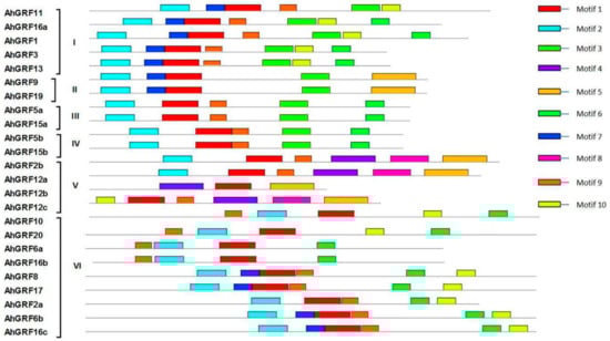 Distribution of conserved domains in AhGRF genes. Ten conserved motifs labeled with different colors were found in the AhGRF sequences using the MEME program. Among them, motif 1, motif 2, motif 4 and motif 6 are the QLQ, WRC, GGPL and FFD conserved domains. The sizes of motifs are proportional to their sequence length.