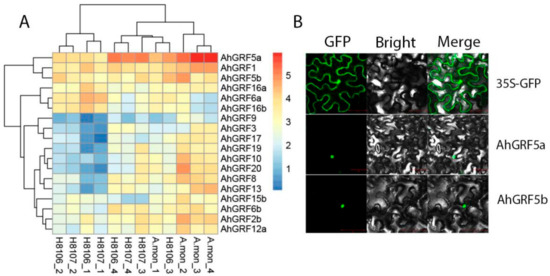 To gain insight into the functions of AhGRF genes, we measured the expression levels of eighteen genes in three varieties during pod development and built a heatmap of the results (Figure 4A; Table S4). More GRFs were expressed at higher levels in the wild species. AhGRF5a was expressed at high levels in Arachis monticola (A.mon) and H8107 species, and had highly expressed in the later stage of pod development. Meanwhile, AhGRF5a and AhGRF5b GFP expression vectors were constructed, and two proteins were localized on the nuclear (Figure 4B).