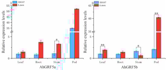 We further investigated the expression levels of AhGRF5a and AhGRF5b in different tissues between A.mon and H8107 (Figure 5), and found that genes expressed at higher levels in pod tissues than roots, leaves and stems tissues, existing in the difference between the two lines. Expression levels of AhGRF5a and AhGRF5b in leaves, roots and pods of A.mon were higher than H8107. In particular, expression of AhGRF5a and AhGRF5b in A.mon pods were 1.72-fold and 17.63-fold greater than in H8107, and AhGRF5b was achieved extremely significant differences. These results suggest that AhGRF5a and AhGRF5b may play the dominant role during the development of pods.