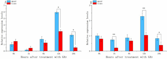 Expression analysis of AhGRF genes in response to treatment with the hormone GA3. qRT-PCR analysis of AhGRF transcript levels was performed on 2-week-old seedlings treated with GA3-0 h, GA3-1 h, GA3-6 h, GA3-12 h, GA3-24 h. (A) AhGRF5a and (B) AhGRF5b. Experiments were repeated three times and vertical bars indicate standard errors. * and ** represent significant differences at p < 0.05 and p < 0.01, respectively.