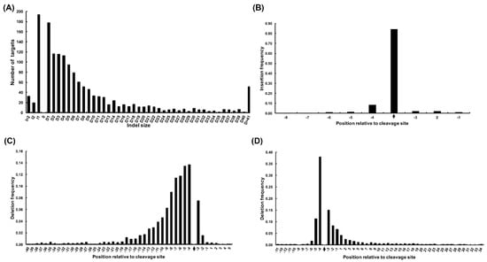 Summary of on-target variations in multiple plants subjected to clustered regularly interspaced short palindromic repeats (CRISPR)/CRISPR-associated protein (Cas9)-mediated editing. (A) Distribution of the most common indel size at on-target sites. ‘D’ represents deletion and ‘I’ represents insertion. (B) Distribution of the insertion sites of the targets. ‘−1’ on the X-axis represents 1 nt upstream of the protospacer adjacent motif (PAM), and black arrows represent cleavage sites. (C) Distribution of the starting sites of deletions at target sites. (D) Distribution of the ending sites of deletions at target sites.