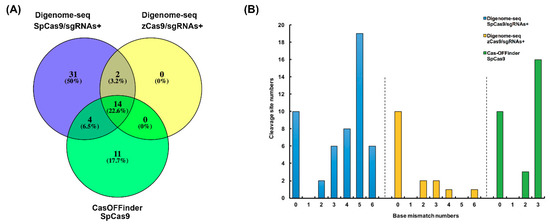 Comparison of off-target prediction results. (A) Venn diagram of predicted off-target sites of Digenome-seq and Cas-OFFinder. (B) Distribution of base mismatches with on-target sequences of digenome-seq and Cas-OFFinder. The number of mismatches did not include mismatches in the PAM sequence.