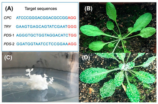 Arabidopsis T1 mutants obtained via CRISPR/Cas9. (A) Target sequences for constructing CRISPR/Cas9-edited mutants. The 19 nt target sequences and the following PAMs (NGG) are highlighted in blue and red, separately. (B) The phenotype of wild-type Arabidopsis. (C) The phenotype of CRISPR/Cas9-edited PDS mutant. (D) The phenotype of CRISPR/Cas9-edited TRY and CPC mutant.