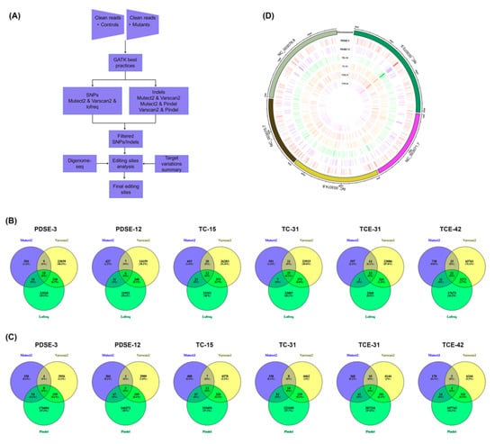Whole-genome variations analysis in genome-edited mutants. (A) Workflow of whole-genome detection of single nucleotide variations (SNVs) and indels. (B) Venn diagram of SNVs in genome-edited mutants detected by variant callers. (C) Venn diagram of indels in genome-edited mutants detected by variant callers. (D) Genome-wide distribution of mutations in CRISPR/Cas9-edited mutants.