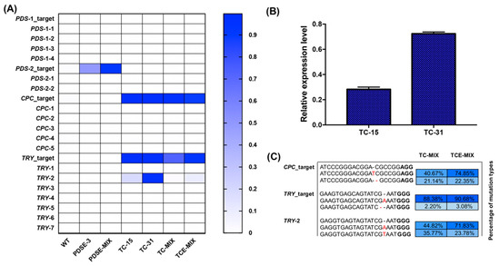 The CPC and TRY on-target editing efficiency of the TC-31 and TC-15 mutants were above 99.0%, and the off-target efficiency of the TC-31 was equivalent to the on-target sites, which was 98.2%. This result was consistent with the research that off-target editing efficiency may be equal to, or higher than, on-target editing efficiency in human cells [31]. However, the off-target editing efficiency of TC-15 was only 18.6%, indicating that a high expression level of zCas9 may have increased the off-target editing efficiency (Figure 5A,B). Compared with TC-MIX, the editing efficiency of the TRY target and the one inevitable off-target in TCE-MIX were relatively high. Moreover, the main mutation types of TC-MIX and TCE-MIX were the same, indicating that repairing via the NHEJ pathway may have some biases (Figure 5C).