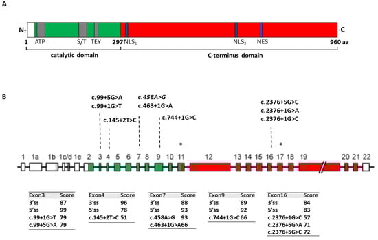 Schematic representation of the CDKL5 gene and protein. (A) Schematic representation of the human isoform hCDKL5-1 [18] with its principal functional domains. The catalytic domain is shown in green while the included ATP binding site (ATP), the Ser/Thr kinase active site (S/T) and the Thr-Glu-Tyr (TEY) motif are highlighted in grey. The C-terminus domain is depicted in red and the nuclear localization signals (NLS1 and NLS2) and nuclear export signal (NES) are in blue and violet, respectively. (B) Schematic representation of the CDKL5 gene with introns and exons represented respectively by lines and boxes. Nucleotide variants investigated in this study are reported in the upper part of the figure. Asterisks denote the exons whose presence differs between different transcript isoforms. The bioinformatics prediction of 3′ and 5′ss scores for each exon in normal and pathological condition is reported in the lower part of the panel.