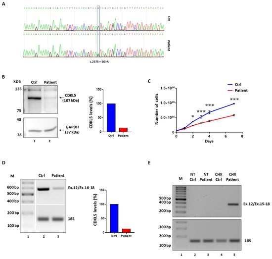 Ex vivo studies indicate that the c.2376+5G>A variant is associated with exon 16 skipping and nonsense-mediated mRNA decay. (A) Electropherograms showing the sequence of CDKL5 exon 16 in a control (Ctrl) or a heterozygous patient harboring the c.2376+5G>A mutation obtained from the genomic DNA of the corresponding lymphoblastoid cell lines. The position of the mutation is indicated by a blue rectangle. (B) Western blotting analysis of CDKL5 expression in the immortalized lymphocytes from the control (lane 1) or the CDKL5-deficiency disorder (CDD) patient (lane 2). Histograms report the amount of CDKL5 protein isoform calculated by densitometric analysis of bands and normalized to GAPDH. (C) Growth rate curve of immortalized lymphocytes from the control donor or the CDKL5 patient. Asterisks indicate a significant difference between the number of control and patient’s cells at the selected time points. * p < 0.05; *** p < 0.001 by two-way repeated measure ANOVA, followed by Sidak’s multiple comparison test. (D) Reverse transcriptase (RT)-PCR evaluating the splicing pattern of CDKL5 exon 16 in the immortalized lymphocytes using the forward primer located in exon 12 and the reverse primer binding the exon 16–18 junction. Levels of 18S rRNA were used as internal standard. Histograms report the relative amount of correctly spliced CDKL5 mRNA in patient’s cells with respect to control, arbitrarily set at 100%. (E) Evaluation of CDKL5 exon 16 skipping transcripts after 4 h of cycloheximide treatment (CHX; 300 mg/mL) by RT-PCR using the forward primer located in exon 12 and the reverse primer binding the exon 15–18 junction. Thus, 18S amplification was used as internal standard.
