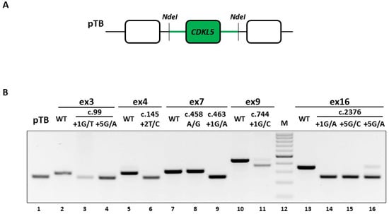 For the minigene splicing assay, human CDKL5 (hCDKL5) exons 3, 4, 7, 9 or 16 and approximately 500 bp of each flanking intronic sequence were cloned into the pTB vector (pTBNde (min) was a gift from Prof. Franco Pagani, Addgene plasmid #15125) using the unique site NdeI. Splicing mutations were inserted using the Q5 Site Directed Mutagenesis kit (New England Biolabs, Ipswich, MA, USA).