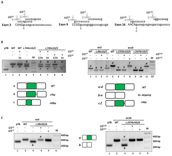 - Alanis, E.F.; Pinotti, M.; Mas, A.D.; Balestra, D.; Cavallari, N.; Rogalska, M.E.; Bernardi, F.; Pagani, F.; Fernandez Alanis, E.; Pinotti, M.; et al. An exon-specific U1 small nuclear RNA (snRNA) strategy to correct splicing defects. Hum. Mol. Genet. 2012, 21, 2389–2398. [Google Scholar] [CrossRef]