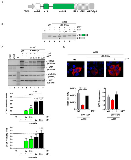2.4. The U1snRNA-mediated Splicing Correction Results in Restoration of CDKL5 Protein Synthesis and Activity