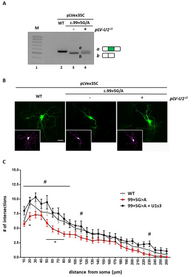 U1s3snRNA rescues the dendritic morphology of Cdkl5 null hippocampal neurons. (A) RT-PCR analysis of CDKL5 splicing in hippocampal WT neurons infected at DIV1 with lentiviruses expressing either the WT (pLLSC-CDKL5WT) or the mutant pLLSC-CDKL599+5A (c.99+5G>A) cDNA alone or in combination with lentiviruses expressing ExSpeU1S3 (pLV-U1s3). (B) Representative immunofluorescences of GFP positive Cdkl5 null neurons (in green) and the corresponding masks (in violet) are reported. Neurons were infected at DIV1 with the WT or the mutant pLLSC-CDKL599+5A construct alone or in combination with viruses expressing ExSpeU1S3, and morphologically analyzed by Sholl analysis plug-in. Scale bar 20 µm. (C) The graph shows the mean ± SEM of the numbers of intersections of neurons of each experimental group. Data were analyzed by two-way ANOVA, followed by Tukey’s multiple comparison test. * p < 0.05 indicates a significant difference between c.99+5G>A and WT vector infected neurons; # p < 0.05 indicates a significant difference between c.99+5G>A and c.99+5G>A + pLV-U1s3.