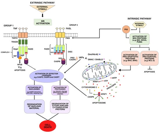 Apoptosis is a normal mechanism that can occur at any stage of the individual’s development or upon cell damage, and is marked by the following characteristics: Protein cleavage (occurring mainly by the activation of cysteine proteases known as caspases), nuclear DNA breakdown, and apoptotic cell recognition by phagocytic cells []. These processes are responses to internal (intrinsic or mitochondrial) or external (extrinsic pathway or death receptors, DR) stimuli to the cell, converging in the final stage, known as the apoptotic execution phase (Figure 1).