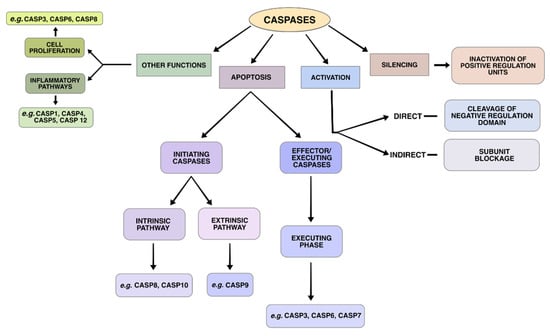 There are many types of caspases (Figure 2), namely Caspases -2, -3, -6, -7, -8, -9, -10 and Caspase-activated DNAse (CAD) [,]. These proteins are classified as initiators (e.g., CASP2, CASP8, CASP9, and CASP10) or effectors/executioners (e.g., CASP3, CASP6, and CASP7) according to their role in apoptotic pathways []. Initiators activate executioners, which in turn activate other executioners in a feedback loop, affecting essential structural proteins and other enzymes, so that key features of apoptotic cell death occur [].