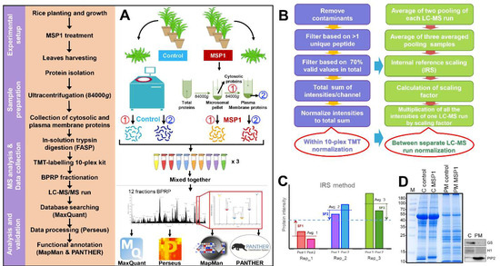 To understand the molecular mechanism of MSP1 induced signaling in rice leaves, protein profiles of cytosolic and PM fractions were generated using a TMT-based proteomics approach (Figure 1A–C). Total cellular proteins were isolated from the rice leaves 24 hours after MSP1 treatment and cytosolic and PM-localized proteins were fractionated using a two-phase partitioning method (Figure 1A). The purity of the extracted PM proteins was checked on SDS-PAGE and Western blots using organelle-specific marker proteins (Figure 1D). Glutamine synthase (GS), histone 1 (H1), and plasma membrane intrinsic protein 2 (PIP2) were used as cytosolic, nuclear and PM specific markers, respectively. Both GS and H1 were not detected in the PM fraction while PIP2 was highly enriched (Figure 1D), indicating high efficacy of the protocol used for the PM protein isolation and high purity of the extracted proteins. For proteome analysis, isolated proteins were subjected to in-solution trypsin digestion by the filter-aided sample preparation (FASP) method and digested peptides from 4 biological replicates and 2 identical pool samples were labeled with TMT-10 plex kit (Table 1). To increase the dynamic coverage of the PM and cytosolic proteome, TMT-labeled peptides were fractionated into 12 fractions by basic pH reverse phase chromatography using an in-house developed stage tip [15]. Altogether, 72 MS runs were performed using 12 fractions each of PM and cytosolic proteome with each fraction run in triplicate (12 × 3 = 36 for cytosolic and 36 for PM). These multiple MS runs carried out could potentially result in the introduction of MS run bias and could affect downstream analysis. Therefore, normalization of TMT data was prerequisite and was carried out at two levels, first among the biological replicates of the same sample within a 10-plex TMT kit and second among the three technical replicates represented by separate MS runs or among different 10-plex TMT kit (Figure 1B). For normalization of samples within a 10-plex TMT kit, reporter ion intensities of each protein were divided with the sum of reporter ion intensity of the respected channel. This normalization was carried out to control the differences in the starting protein amount and TMT-labeling efficiency. For the second normalization, an Internal Reference Scaling (IRS) method was followed as introduced previously [16]. For the IRS method, pooled internal references labeled with two TMT reagents were averaged and compared with the average of pooled internal references of other two runs to calculate the scaling factor. Finally, the intensities of all the proteins were adjusted with the scaling factors as depicted in Figure 1B. Pearson correlation coefficient values among the technical replicates of the same sample increased from 0.93 to 0.99 after normalization (Figure S1).