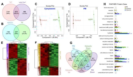 Venn diagram showing comparison of the number of identified proteins (A) in the current TMT based study and a previously published study; (B) in cytosolic and plasma membrane (PM) proteome. PLSDA scores plot showing clear separation of control and MSP1 treated proteins of (C) cytosolic and (D) PM proteome in component 1. Hierarchical clustering analysis of the differential proteins of cytosolic (E) and PM (F) fractions showing clear separation of up- and down-regulated proteins in response to MSP1 treatment. (G) Venn diagram showing distribution of differential proteins in the cytosolic and PM proteome after MSP1 treatment. (H) Functional annotation of the identified cytosolic, PM and commonly identified proteins, corresponding to Figure 2B using PANTHER protein class.