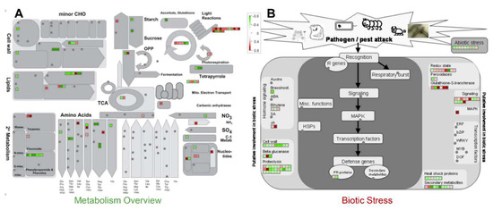 - Thimm, O.; Bläsing, O.; Gibon, Y.; Nagel, A.; Meyer, S.; Krüger, P.; Selbig, J.; Müller, L.A.; Rhee, S.Y.; Stitt, M. mapman: A user-driven tool to display genomics data sets onto diagrams of metabolic pathways and other biological processes. Plant J. 2004, 37, 914–939. [Google Scholar] [CrossRef]