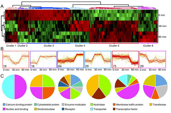 (A) Hierarchical clustering of the identified phosphoproteins with differential phosphosite intensities. (B) Expression profiles and number of identified proteins in each cluster. (C) Functional groups (PANTHER protein class) associated with each cluster are depicted by pie chart.