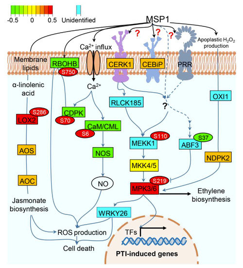 A hypothetical model showing MSP1 induced signaling in rice leaves. Abundance pattern of the identified proteins is shown by red and green color scheme while proteins not identified in this study have been highlighted by the cyan color. Phosphorylation of the respective proteins is shown in the circles with identified phosphosites. Abbreviations: CERK1: chitin elicitor receptor kinase 1, CEBiP: chitin elicitor binding protein, LOX2: lipoxygenase 2, AOS: allen oxide synthatase, AOC: allen oxide cyclase, CDPK: calcium-dependent protein kinase, CaM: calmodulin, CML: calmodulin-like, RBOHB: Respiratory burst oxidase homolog protein B, NOS: nitric oxide synthase, MEKK1: mitogen-activated protein kinase kinase kinase 1, RLCK185: receptor-like cytoplasmic kinase 185, MKK4/5: mitogen-activated protein kinase kinase 4/5, MPK3/6: mitogen-activated protein kinase 3/6, ABF3: ABA-responsive elements-binding factor 3, OXI1: oxidative signal-inducible1 (OXI1) serine/threonine protein kinase, NDPK2: nucleoside-diphosphate kinase 2, ROS: reactive oxygen species, TFs: transcription factors.