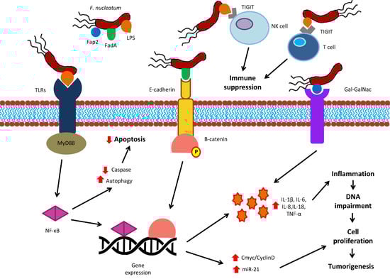 The various molecular pathways of tumorigenesis associated with F. nucleatum are represented in Figure 1.
