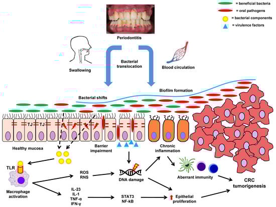 All in all, the orally-driven intestinal dysbiosis in favor of opportunistic pathobionts results in impairment of the colon mucosa, increased bacterial invasion and translocation, stimulating the innate and adaptive immunity, leading to a chronic inflammatory state [187]. More specifically, the activated components of the innate immunity (dendritic cells, macrophages, and NK cells) secrete pro-inflammatory cytokines, including IL-12, IL-23, TNF-α, and interferon-gamma (IFN-γ), which in turn induces the response of the components of the adaptive immunity (T and B lymphocytes) [36]. The major result of this inflammatory response is the upregulation of specific epithelial signaling cascades, including NF-κΒ and STAT3 [188], and the production of reactive nitrogen and oxygen species. These phenomena leads to oxidative stress, DNA insult, irregular cell proliferation, and, finally, the development of colorectal adenomas and cancerogenesis.