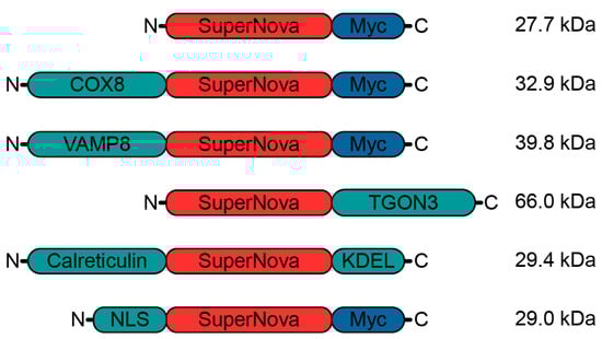 - Takemoto, K.; Matsuda, T.; Sakai, N.; Fu, D.; Noda, M.; Uchiyama, S.; Kotera, I.; Arai, Y.; Horiuchi, M.; Fukui, K.; et al. SuperNova, a monomeric photosensitizing fluorescent protein for chromophore-assisted light inactivation. Sci. Rep. 2013, 3, 2629. [Google Scholar] [CrossRef]