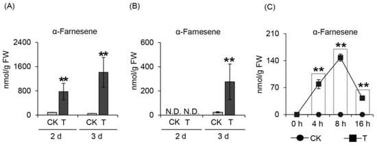 The formation of α-farnesene induced by two main herbivores and wounding stress in C. sinensis cv. Jinxuan. (A) Under tea green leafhopper attack; (B) Under tea geometrid attack. CK, without herbivores attack collected in different treatment time. T, with herbivores attack collected in different treatment time. (C) Under wounding stress; CK, without continuous wounding stress collected in different treatment time. T, with continuous wounding stress collected in different treatment time. Significant differences between control and treatment at the same treatment time are indicated (** p ≤ 0.01). N.D., not detected; FW, fresh weight.