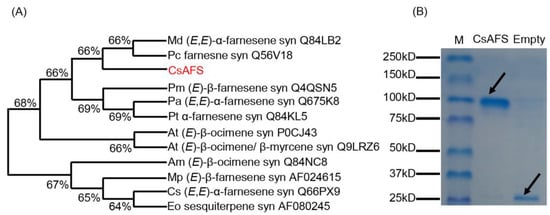 Phylogenetic analysis and SDS-PAGE analysis of α-farnesene synthase CsAFS. (A) The phylogenetic tree of α-farnesene synthase in different plant species, which was obtained by using MEGA-7 software with the neighbor-joining computation. Am, Antirrhinum majus; At, Arabidopsis thaliana; Cs, Cucumis sativus; Eo, Elaeis oleifera; Md, Malus domestica; Mp, Mentha x piperita; Pa, Picea abies; Pc, Pyrus communis; Pm, Pseudotsuga menziesii; Pt, Pinus taeda; CsAFS, α-farnesene synthase in Camellia sinensis. (B) SDS-PAGE analysis of recombinant CsAFS expressed in Escherichia coli (E. coli). Black arrows indicate target proteins.