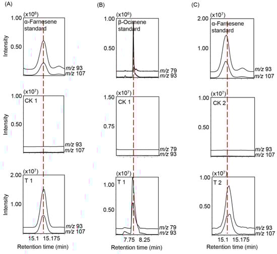 To identify the α-farnesene synthase (CsAFS) in tea plants, we compared homologous sequences of monoterpene and sesquiterpene synthases from the TPS family. Accordingly, we selected the syntheses of sesquiterpene, farnesene, α-farnesene, (E)-β-farnesene, (E,E)-α-farnesene, and (E)-β-ocimene in different plants belonging to the TPS-a, TPS-b, TPS-g, and TPS-d1 subfamilies (Figure 2A). Phylogenetic analysis indicated that CsAFS had a high similarity (66%) to MdAFS and farnesene synthase in Pyrus communis (pear) (Figure 2A), while only MdAFS in apple was related to (E,E)-α-farnesene formation. These results suggested that the CsAFS probably encoded α-farnesene synthase in tea plants. To validate the enzyme function of CsAFS in α-farnesene synthesis in tea leaves, cDNA of CsAFS was cloned into Escherichia coli (E. coli) expression vector pET32a, and the obtained recombinant protein was assayed for CsAFS function (Figure 2B). We used solid-phase microextraction (SPME) to collect products and utilized gas chromatography–mass spectrometry (GC-MS) to perform analysis. The results showed that recombinant protein CsAFS converted substrate farnesyl diphosphate (FPP) into α-farnesene as the final product. Furthermore, with geranyl diphosphate (GPP) as substrate, the CsAFS enzyme produced only β-ocimene, with no α-farnesene detected. No terpene products were found in the control, which carried the empty pET32a vector (Figure 3A,B). Our analysis of the recombinant CsAFS protein showed that the enzyme can produce α-farnesene or β-ocimene in vitro depending on the substrate. CsAFS enzyme activity produced α-farnesene as the only product from FPP as substrate.