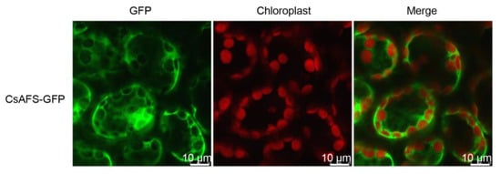 Subcellular localization of CsAFS protein in transformed N. benthamiana. Green fluorescence indicated CsAFS-GFP fusion protein, and red fluorescence indicated the chloroplast auto-fluorescence.