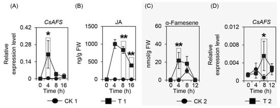Changes in expression level of CsAFS, and contents of JA and α-farnesene under wounding stress and JA treatment, respectively. Variety of expression level of CsAFS (A) and JA content (B) after wounding stress. CK 1, without continuous wounding stress collected in different treatment time. T 1, with continuous wounding stress collected in different treatment time. Variety of α-farnesene content (C) and expression level of CsAFS (D) after JA treatment. CK 2, H2O containing 0.5% alcohol treatment collected in different treatment time. T 2, JA containing 0.5% alcohol treatment collected in different treatment time. Significant differences between control and treatment at the same different treatment time are indicated (* p ≤ 0.05, and ** p ≤ 0.01). JA, jasmonic acid; AFS, α-farnesene synthase; FW, fresh weight.
