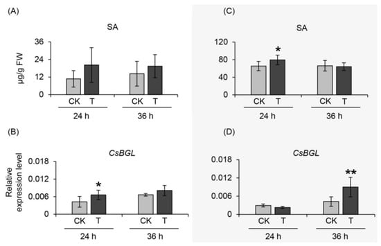 Changes in phytohormones content and expression levels of resistant related genes under α-farnesene in different treatment time, 24 h and 36 h. (A,B) All of the tea samples were collected in September 2018; (C,D) All of the tea samples were collected in June 2019. CK, dichloromethane (CH2Cl2) treatment collected in different treatment time. T, α-farnesene dissolving in CH2Cl2 treatment collected in different treatment time. Significant differences between control and treatment at the same treatment time are indicated (* p ≤ 0.05, and ** p ≤ 0.01). SA, salicylic acid; BGL, β-1, 3-glucanase; FW, fresh weight.