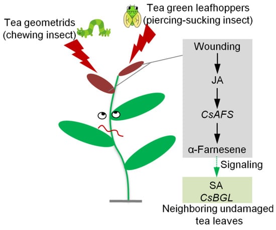 Summary on herbivore-induced formation of α-farnesene and its effect on defense ability of neighboring tea plants as a volatile signal. JA, jasmonic acid; AFS, α-farnesene synthase; SA, salicylic acid; BGL, β-1, 3-glucanase.