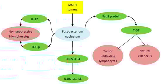 Fusobacterium correlated with poor outcome in high microsatellite instability (MSI-H) colorectal tumors by activating inflammatory mediators (interleukin (IL)1B, IL6, and IL8), secreting IL-12 and transforming growth factor β (TGF-β), and inhibiting natural killer cells and tumor infiltrating lymphocytes. TLR, Toll-like receptor.