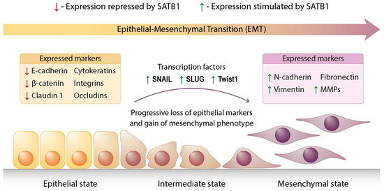 For over 50 years carcinogenesis was thought to rely on the sequential accumulation of gene mutations. It was assumed that 6 or more genetic alterations were required to initiate the most common types of cancer [14,15]. However, recent studies have shown that in order to trigger the pathways leading to advanced cancers of lung and colon, only 2 or 3 mutations are sufficient [16]. After its initiation, cancer gradually evolves, gaining new mutations and aberrant gene expression patterns. The analysis of typical solid tumours revealed so many genetic alterations that it would be almost impossible to identify the most important “driver” ones. Moreover, epigenetic modifications, gene fusions and chromosomal translocations additionally complicate our understanding of the molecular basis of cancer. The process of cancer progression is very complex, but one should not forget that its starting point may just be a few genetic disorders. The important question is whether it is possible for mutations or changes in the expression of only a single gene to lead to the activation of other cancer-promoting mechanisms, including EMT. In 2008, Han et al. described a unique protein that is able to promote tumour progression and metastasis by globally changing the transcriptional profiles of hundreds of genes [17]. It was Special AT-Rich Binding Protein 1 (SATB1), a powerful transcription factor with wide regulatory abilities.