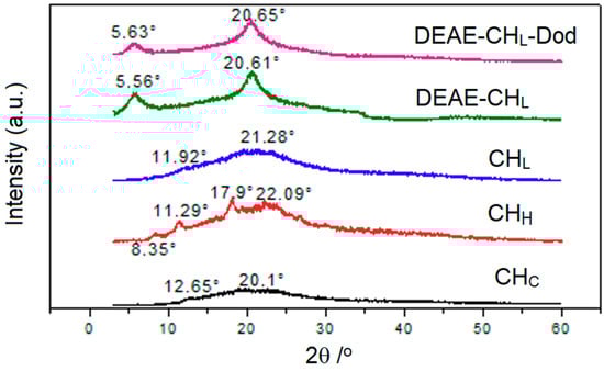 X-ray diffractograms of all films without plasticizers are shown in Figure 1. In general, films prepared by casting without plasticizers displayed amorphous structures denoted by the broad peak centered at 2θ~20°. The CHC diffractogram shows only a broad peak centered at 2θ~20°, while deacetylated chitosan (CHH) film displayed three peaks at 2θ = 8.35°, 11.29°, and 17.90° which have been attributed to the hydrated crystalline region (8.35°, 11.29°) and the amorphous region (17.90°) [24]. In contrast to CHL, the diffractograms of films prepared with its derivatives DEAE-CHL and DEAE-CHL-Dod are distinct by the appearance of a peak centered at 2θ~5.6°, which indicates the formation of crystalline regions resulting from the grafting with DEAE groups. Although the DEAE group is a tertiary amino group, it gives the polymer chain an amphipathic character due its methyl and methylene groups. Similar appearances have been observed for N-octanoyl and N-myristoyl chitosans [25], suggesting that DEAE-CHL has a more crystalline organization than that obtained for the film with CHL.