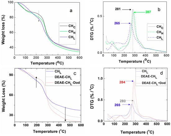 TGA and DTGA curves for films of (a,b) commercial (CHC) and deacetylated chitosans (CHH and CHL) and (c,d) the amphiphilic derivatives (DEAE-CHL and DEAE-CHL-Dod) of chitosan. (Upward arrow indicates increasing stability; Downward arrow indicates decreasing residual mass).
