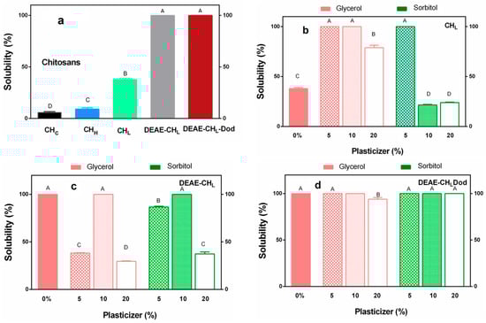 (a) Solubility of chitosan films without plasticizer and prepared with 5%, 10%, and 20% of glycerol and sorbitol for (b) CHL (c) DEAE-CHL and (d) DEAE-CHL-Dod. The values are expressed as means ± SD (n = 5). Different letters in the same graph indicate a significant difference (p < 0.05). The values are expressed as means ± SD (n = 3).