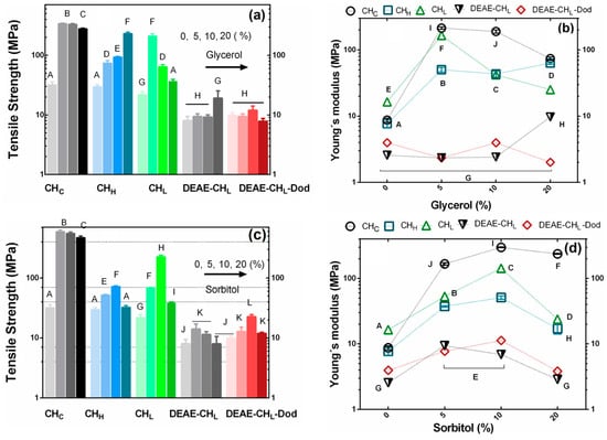 Tensile strength (TS) and Young’s modulus of chitosan films prepared with increasing concentrations of Glycerol (a,b) and Sorbitol (c,d). The values are expressed as means ± SD (n = 5). Different letters indicate a significant difference (p < 0.05).