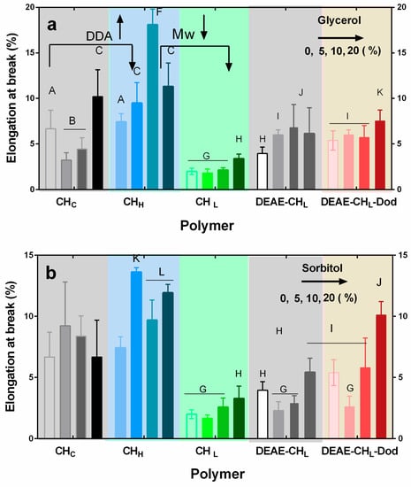 Elongation at break of films prepared with chitosan and its derivatives and increasing percentages of (a) glycerol and (b) sorbitol. The values are expressed as means ± SD (n = 5). Different letters indicate a significant difference (p < 0.05).