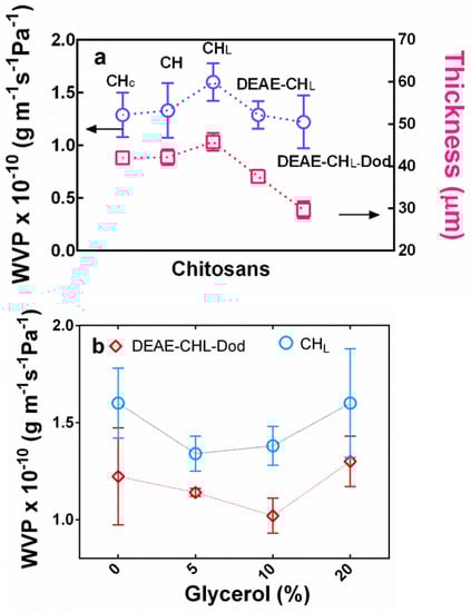 The water vapor permeability (WVP) is one of the most important properties due to the importance of water in deterioration of foods. It is well know that several parameters such as chemical structure, concentration, method of preparation and the presence of additives [32] may affect the water vapor permeability [33]. Hence, in this work, the sequential changes in the chitosan structure, i.e., deacetylation, degradation, and the grafting with DEAE and dodecyl groups, are expected to affect WVP since these processes will change the amphiphilic nature of the polymer chain. To evaluate the effect of structural modifications on WVP for each film, the gain in mass was determined as a function of time and the WVP rate was calculated as described in item 2.8. Figure 6a shows that WVP values for films prepared without plasticizers exhibited a tendency to increase with the deacetylation and degradation processes and then start to decrease with the insertion of DEAE and dodecyl groups. This trend can be explained by the hydrophobic nature of DEAE and dodecyl groups, which also affected the thickness of the films, decreasing them from 45 µm to 30 µm (Figure 6a) with the grafting of these groups. The higher WPV values for CHC, CHH, and CHL are associated with the hydrophilic nature of chitosan provided by the protonated amino groups and their affinity to water, which is gradually decreased with the grafting by DEAE and dodecyl groups (Table 3). This trend for thickness and WVP have been also reported when oils are added to chitosan films [34] and after neutralization of the amino groups [35].