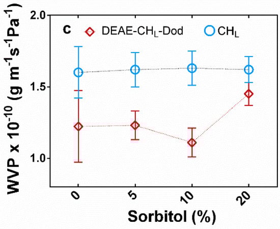 For the films prepared with CHL, DEAE-CHL, and DEAE-CHL-Dod, WVP had a tendency to decrease for formulations with 5% and 10% of plasticizer (Figure 6b and Table 3) and then changed to an increase for 20%, except for the CHL-sorbitol formulations which did not change and WVP remained around 1.6 × 10−10 g m−1 s−1 Pa−1 (Table 3). The addition of glycerol and sorbitol continuously increased the thickness of these films, indicating the plasticizers provide a more hydrophilic surface contributing to an increase in the adsorption of water molecules and the swelling of the films.