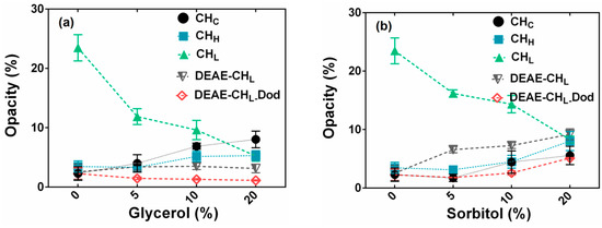 Opacity as a function of (a) glycerol and (b) sorbitol percentages (w/w) for the films prepared with chitosan and its derivatives.