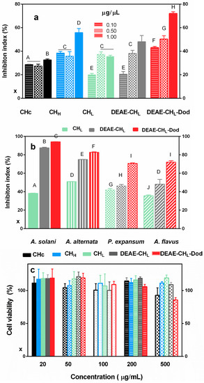 The antifungal activity against Aspergillus flavus was evaluated from the mycelial growth as previously described [22] on the seventh day of cultivation, with the fungus being inoculated in a culture medium containing increasing concentrations of the amphiphilics. The antifungal activity of amphiphilic chitosans against Aspergillus flavus has been shown to depend greatly on molecular weight and degree of grafting [23]. As can be seen from Figure 8, independent of chemical structure, all chitosan samples displayed some antifungal activity against Aspergillus flavus and the inhibition indexes increased in a concentration-dependent manner. This activity of chitosan has been mainly attributed to the adsorption of chitosan chains on the cell wall and the cell membrane, triggered mostly by the electrostatic interactions, affecting the spores and the conidiophores population [23]. Hence the increase of DDA from 77% to 97% resulted in higher inhibition indexes for CHH than for CHC, as a result of the increased availability of amino groups (Figure 8a and Table 1). For CHL, the inhibition ability decreased, which can be attributed to the lower Mw of this sample which in turn may decrease the adsorption on cell wall of the fungi. However, as seen in Figure 8a, the grafting with DEAE and dodecyl groups significantly improved (p < 0.05) the inhibition index, reaching more than 70% for grafted chitosan DEAE-CHL-Dod at 1.0 µg/µL (Figure 8a).