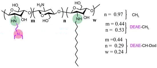 The amphiphilic derivatives were synthesized as previously described using a highly deacetylated chitosan sample (CHH, DD 97%) as starting material [22]. First, CHH was modified with 2-Chloro-N,N-diethylethylamine hydrochloride (DEAE) at pH 8.0 to generate a derivative with a degree of substitution of about 40% [22]. This first derivative was subsequently degraded by sodium nitrite in acetic acid solution [49,50] to obtain the DEAE-CHL derivative of low Mw. Next, the sample of low Mw was recovered by lyophilization and alkylated with dodecyl aldehyde and then reduced using sodium borohydride [51] to obtain a degree of substitution of 20%.